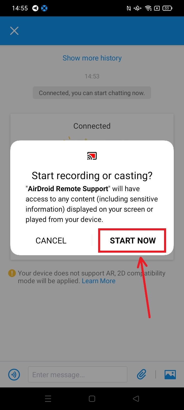 2. The end user will have to click accept for the session to be initiated. For Windows devices, the steps end here. For Android devices, please follow the rest of the instructions.