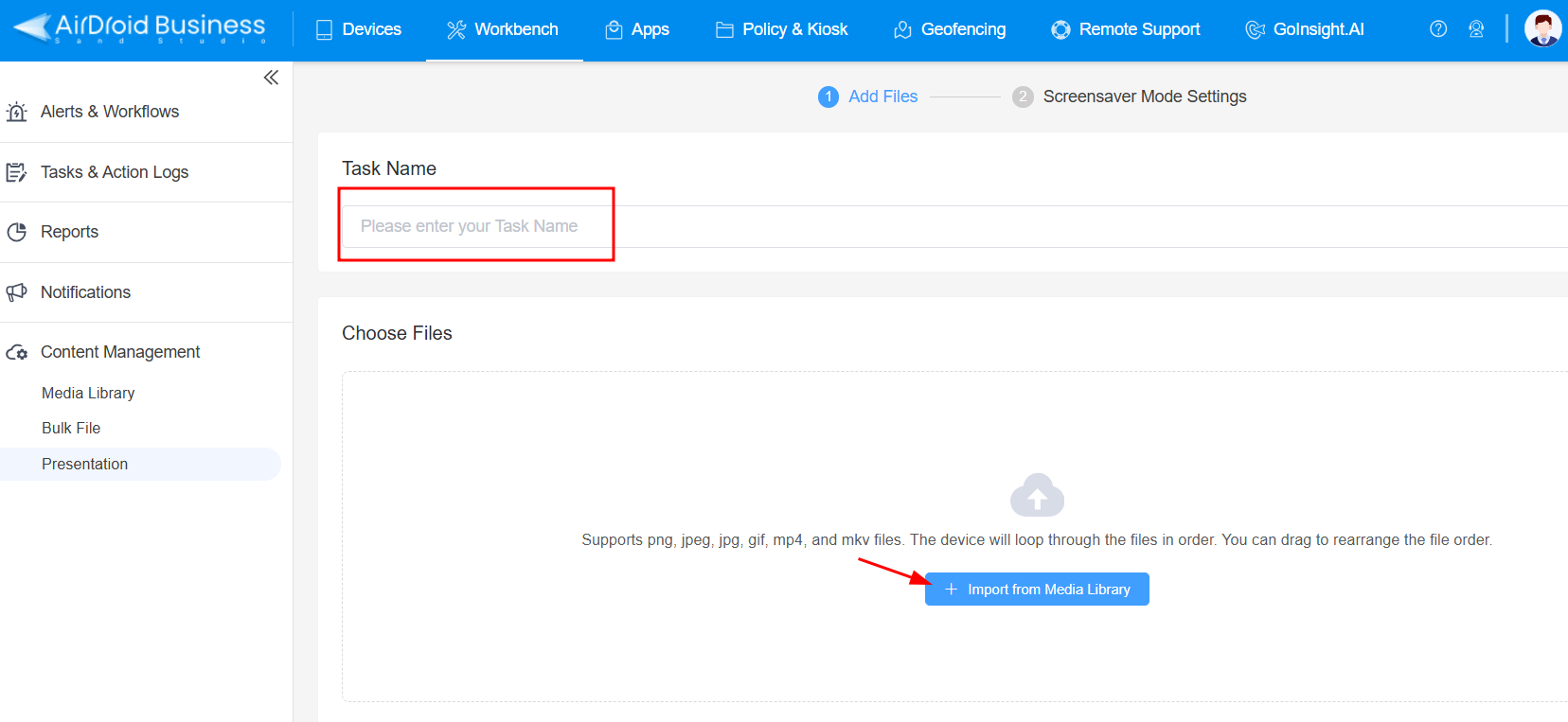 Presentation enables you to import files from the Media Library to run Screensaver or Digital Signage Mode on your Android devices according to your operation. If you do not upload files on Media Library yet, please refer to this article.