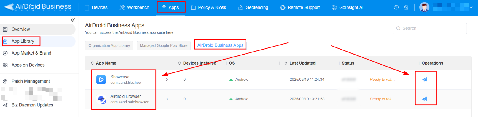 1. Dalla Console di Amministrazione > Seleziona App > Clicca Libreria App > Scegli App AirDroid Business > Clicca Showcase o AirDroid Browser per rilasciare sui tuoi dispositivi.