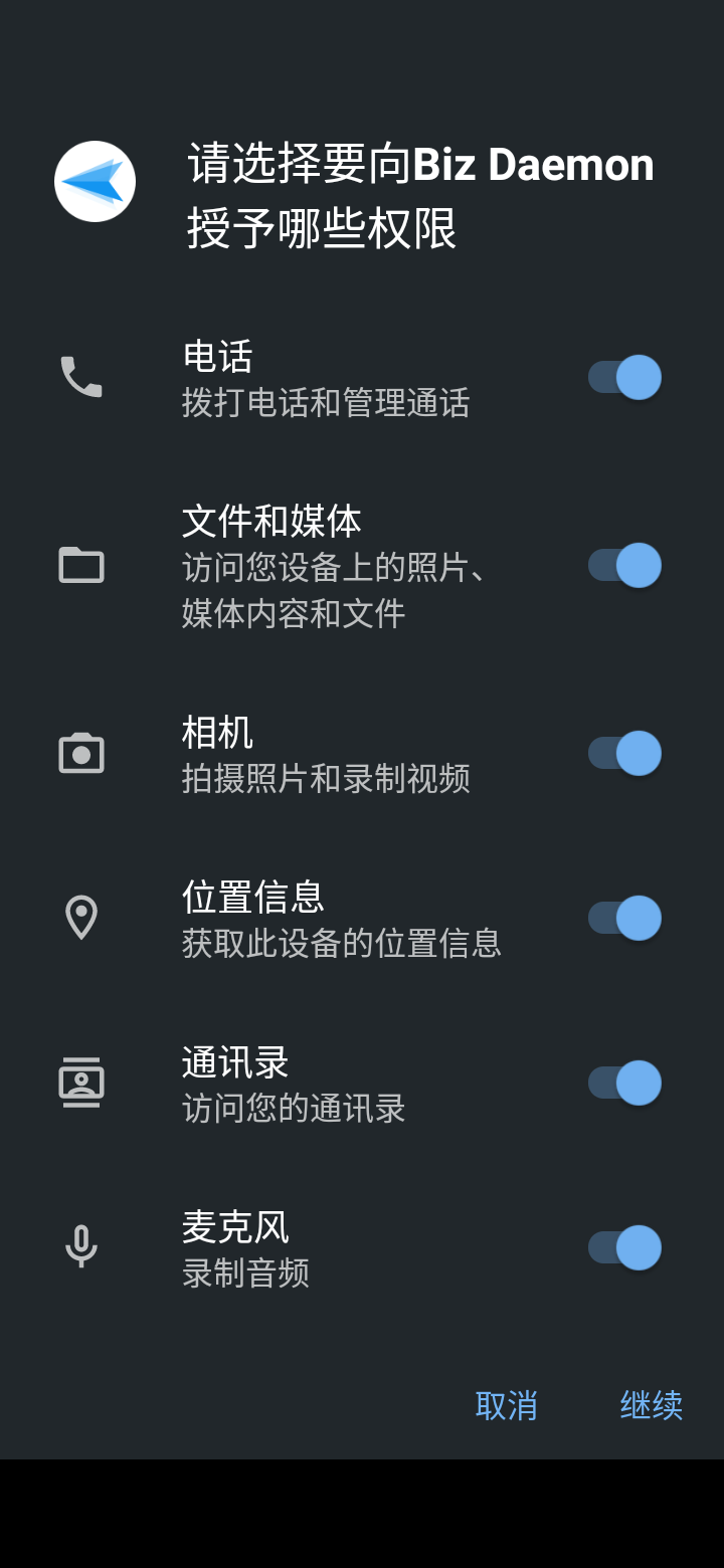 1. 当您第一次开启 Biz Daemon 时,应用程序会要求您提供手机的基本权限。我们建议您允许所有的权限以防止出现任何无法预期的情况。