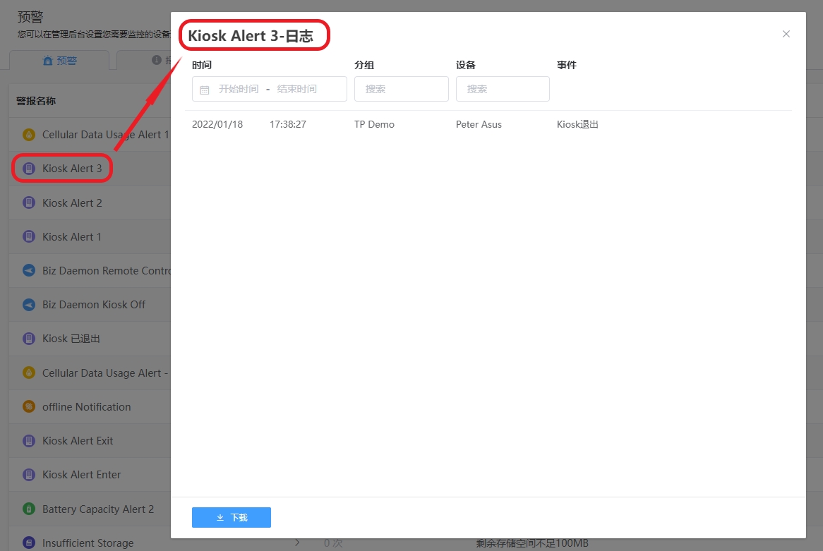 6. 您还可以点击警报名称来查看单个警报的日志。