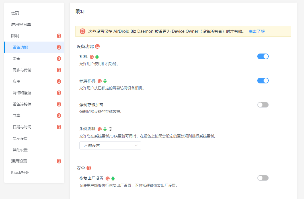策略可以让您限制公司设备的使用并实现更好及更有效率的公司资源管理,配合设备所有者权限,此功能会发挥更好的作用。您甚至可以结合策略与 Kiosk 模式,来极大地改善数字标牌或 POS 设备等的整体客户体验。