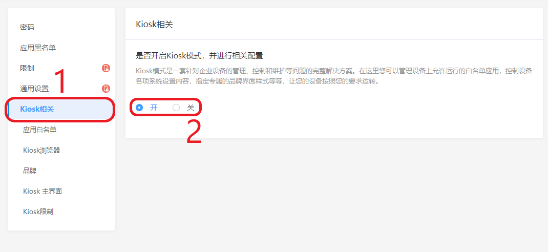 3. 如果您想结合策略与 Kiosk 模式,请单击「Kiosk 相关」,选择「开」,然后像编辑 Kiosk 配置文件一样完成设置。
