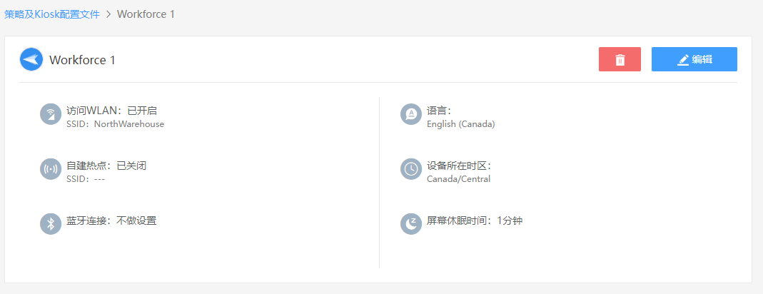 1. 开启管理后台>切换到「策略及Kiosk」分页>选择「策略及Kiosk配置文件」>选择编辑现有的配置文件或点击「+创建配置文件」