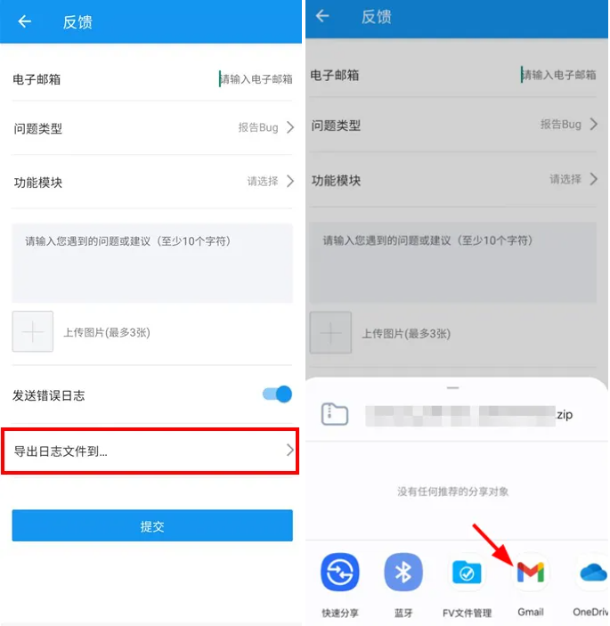 1. 打开 AirDroid Business 应用 > 点击齿轮图标(在无登录下点击 ⋮ 图示)> 反馈 > 点击导出日志文件到... > 选择任何电子邮件应用(例如 Gmail),将日志发送给我们。