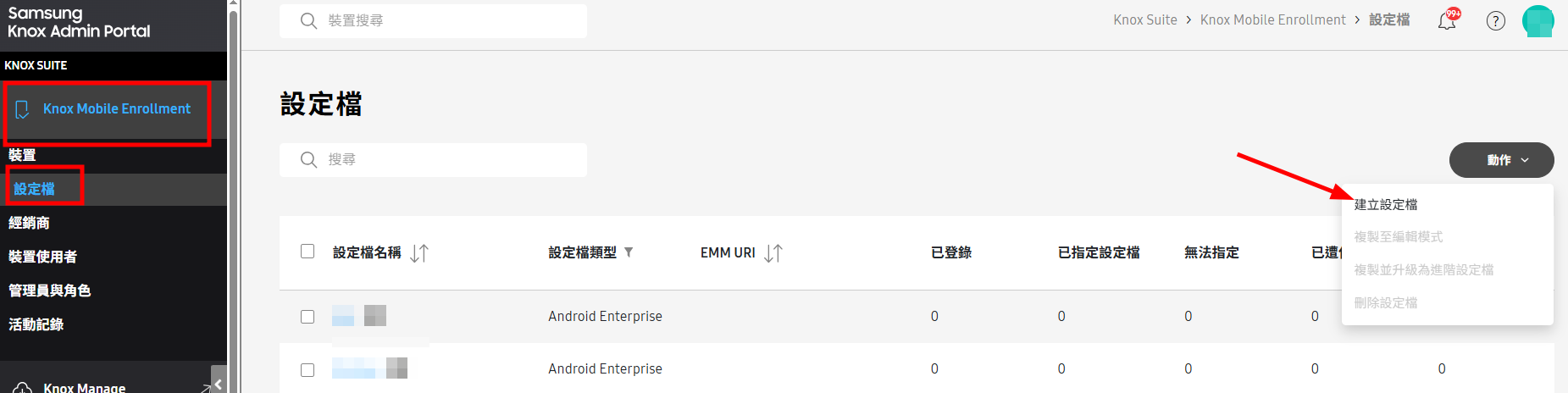 1. 登录三星 Knox 入口帐户 > 选择 Knox Mobile Enrollment > 设定档 > 动作 > 建立设定档。