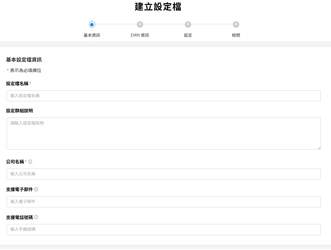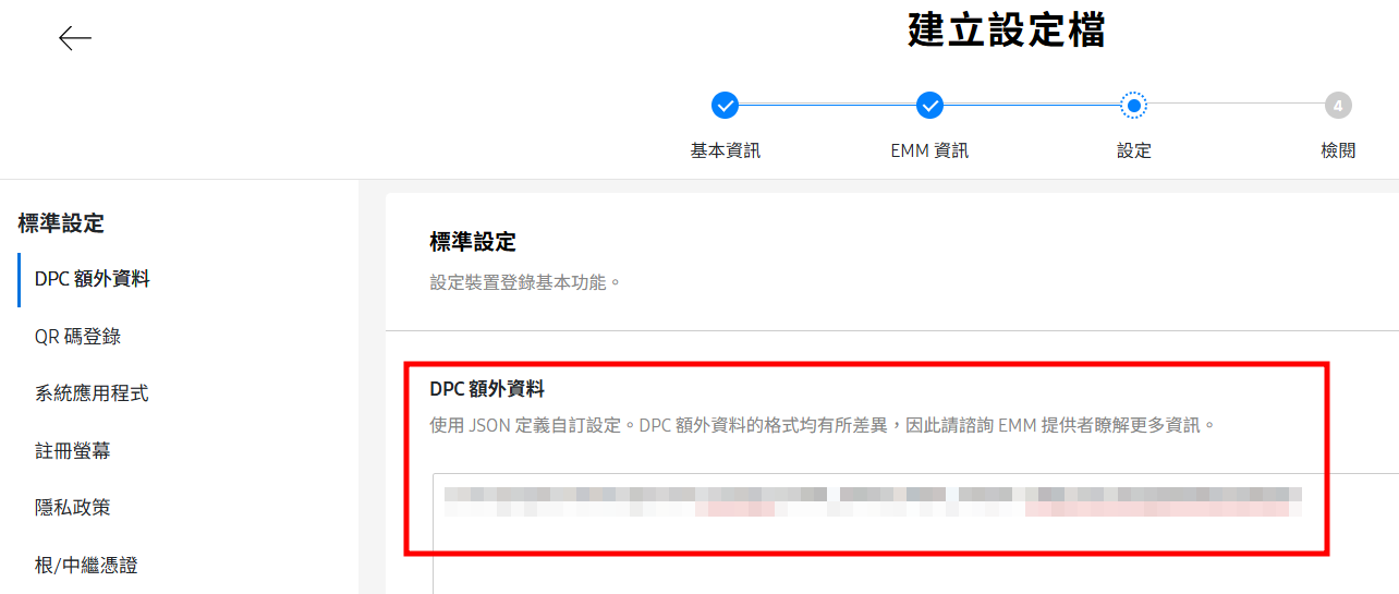 5. 返回三星 Knox 入口网站,将配置参数粘贴到 DPC 額外资料上,并根据需要选择任何其他设置。然后,点击「下一步」继续。