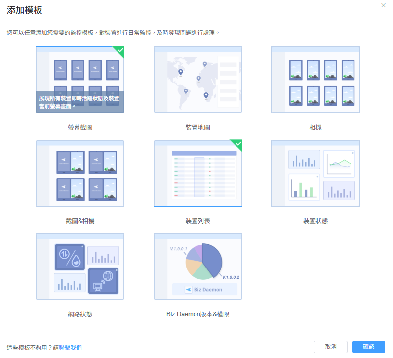 此功能提供 8 種不同的模板,讓您有效率地監控 Android 裝置。它包括裝置狀態、網路狀態、Biz Daemon 版本&權限、裝置列表、裝置地圖、螢幕截圖、相機以及截圖&相機。