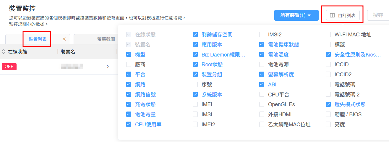 ● 「裝置列表」模板:您可以設定自己的清單,以便模板僅顯示您想要的詳細資訊