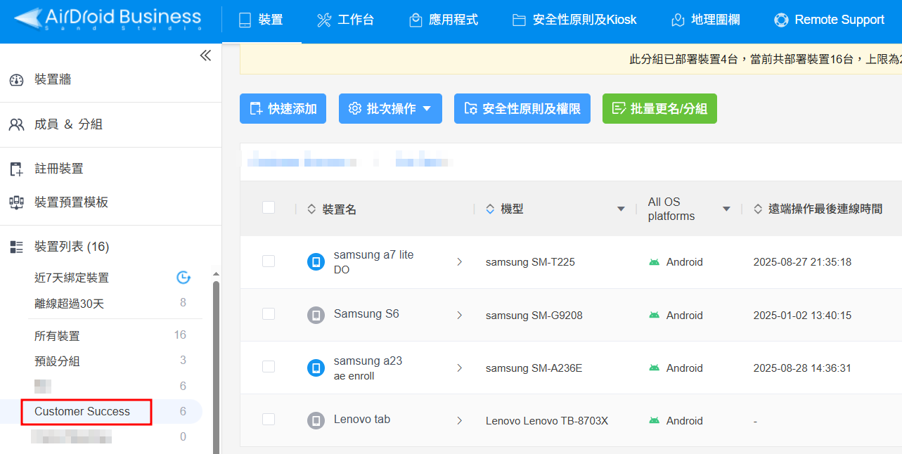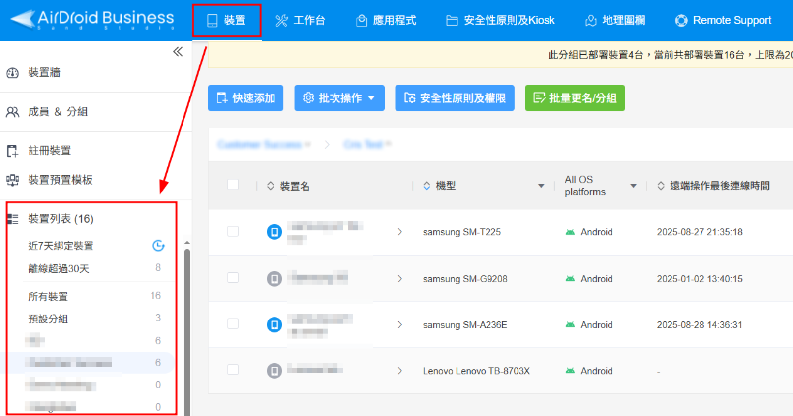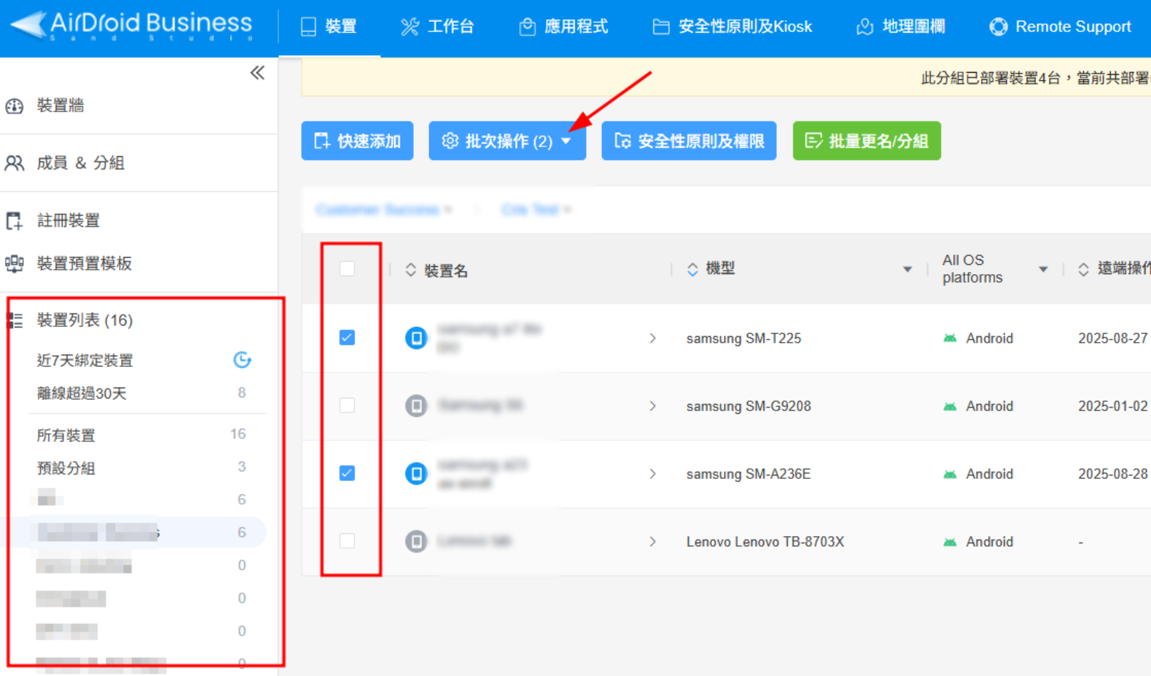 1. 前往裝置 > 點選特定分組或所有裝置 > 勾選您希望批次操作的裝置 > 點選批次操作。
