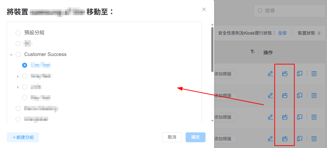 4. 第二個資料夾圖示可讓您將一個或多個裝置從一個群組移動到另一個群組。