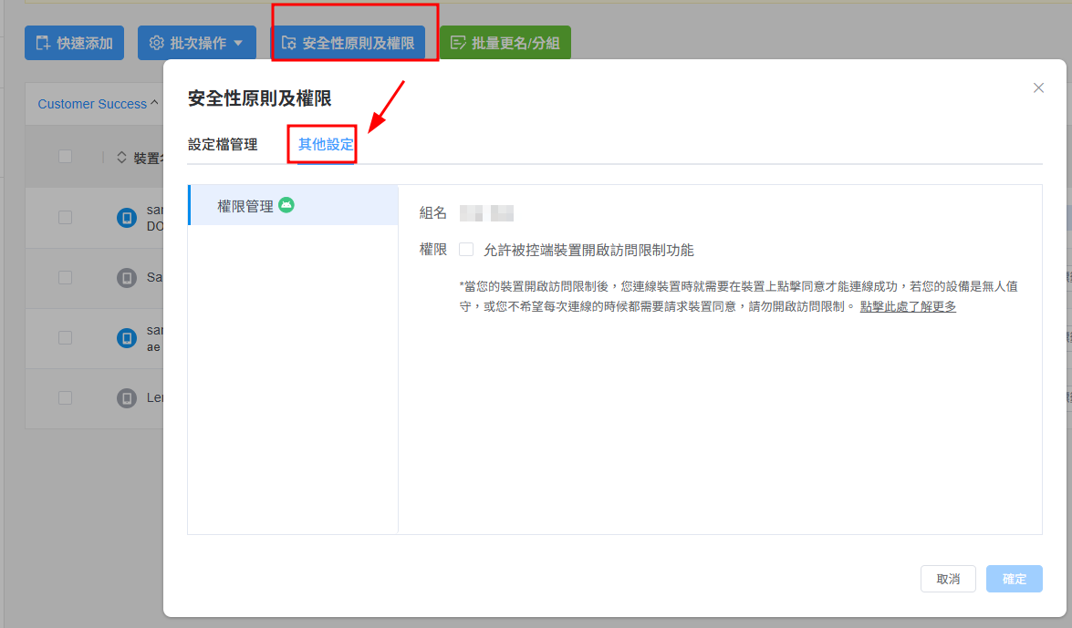 9. 您也可以透過點選安全性原則及權限 > 其他設定 > 權限管理來設定群組中 Android 裝置的訪問權限。