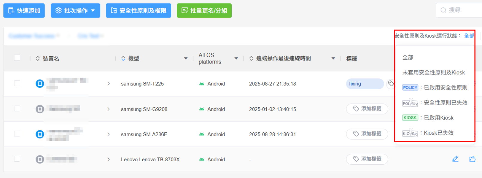 8. 如果您想根據安全性原則及 Kiosk 模式狀態篩選群組中的裝置,請參考以下範例: