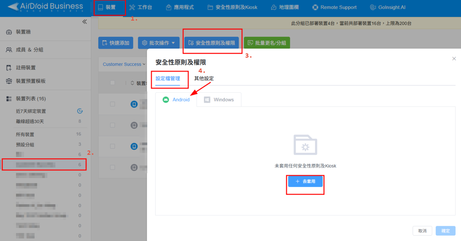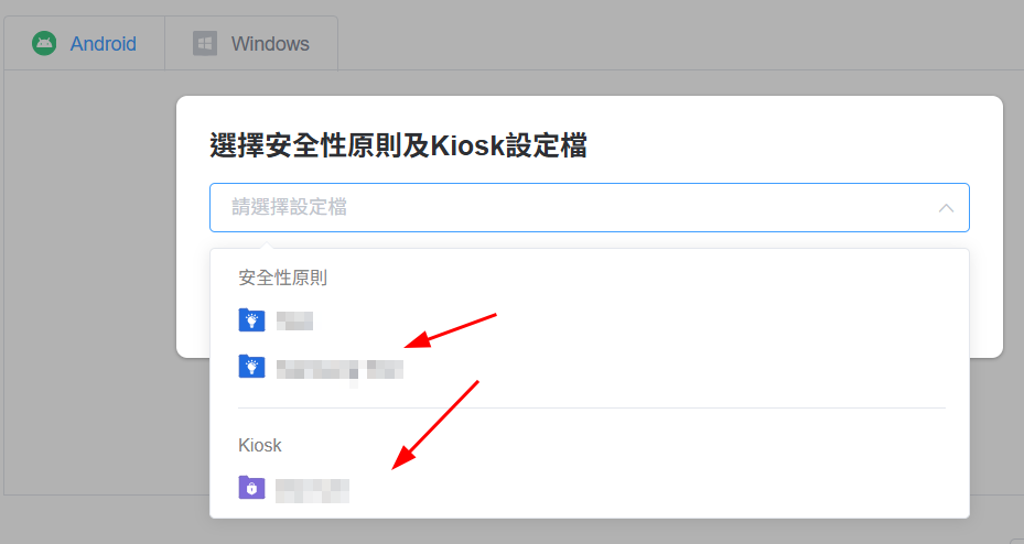 4. 您還可以透過點選安全性原則及權限 > 設定檔管理 > 選擇 Android 或 Windows > + 去套用,為一群 Android 或 Windows 裝置套用安全性原則/Kiosk 設定檔。