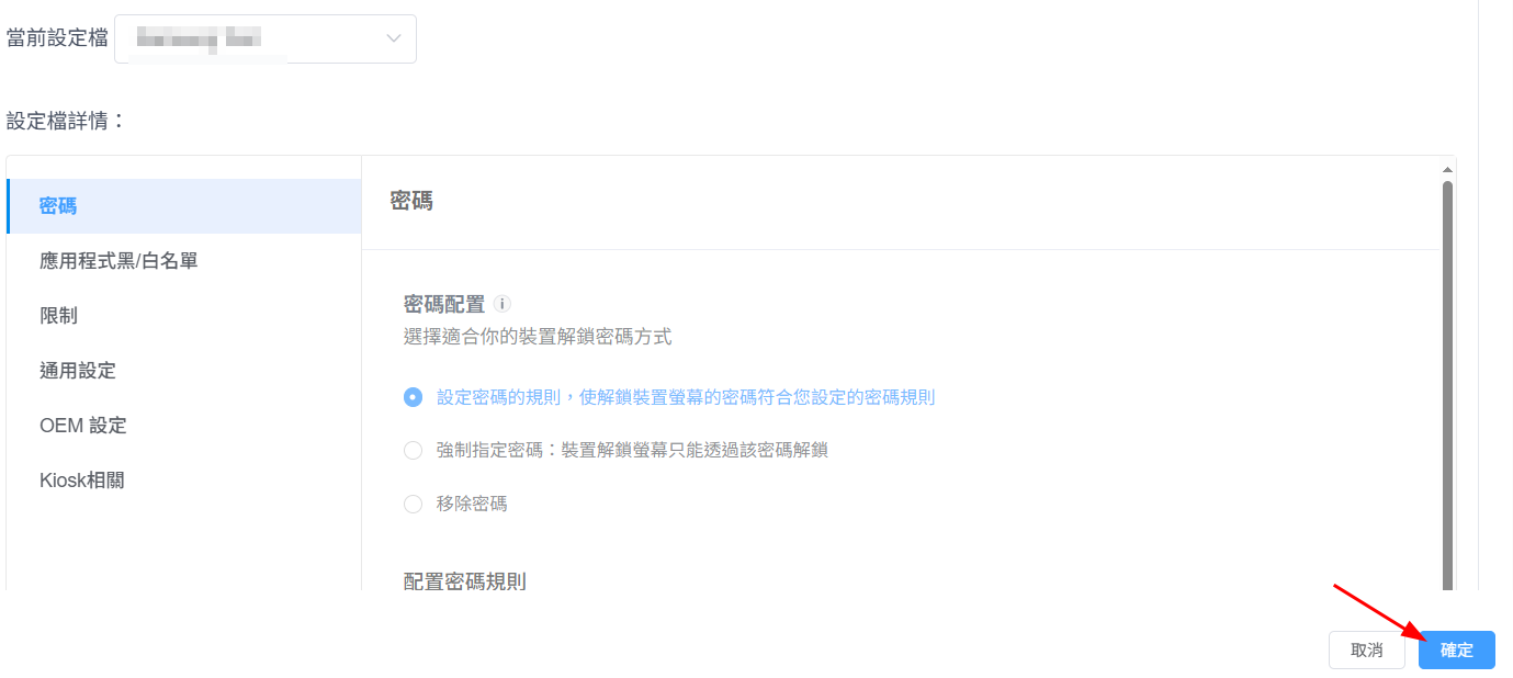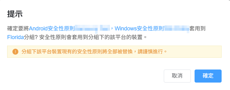5. 然後,您可以選擇特定的安全性原則/Kiosk 設定檔並查看目前的配置設定。您可以點選確定將其套用到群組,並覆蓋群組中 Android 或 Windows 裝置的設定檔。