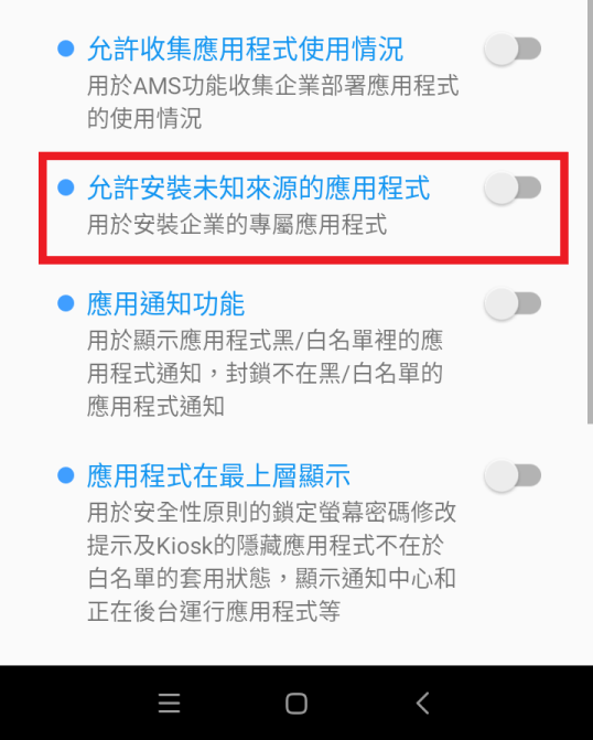 ● 允許安裝未知應用程式:用於 AMS 應用程式安裝等。
