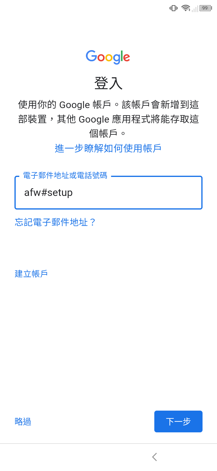 2. 當您看到裝置系統要求您設定您的 Gmail 帳戶時,請在 Gmail 登入頁面的輸入框中輸入「afw#setup」。然後繼續完成裝置上的以下步驟。