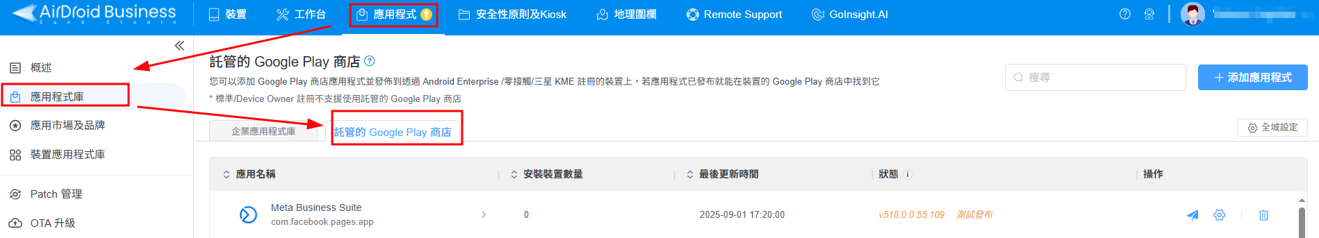 登入管理後台 > 切換到「應用程式」分頁 > 選擇「應用程式庫」 > 切換到「託管的 Google Play 商店」