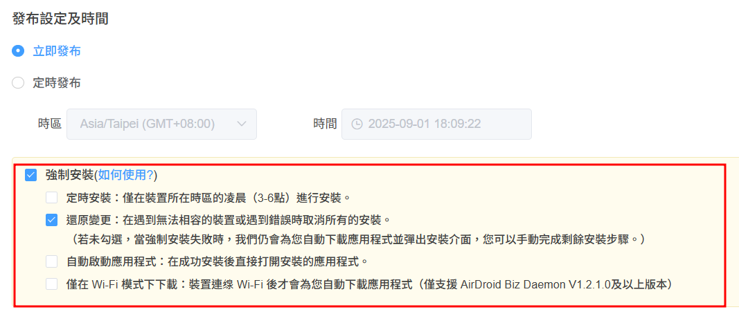 若要設定「強制安裝」選項,請捲動到發佈頁面底部,您將看到 發佈設定與發佈時間。請勾選方塊以啟用它。