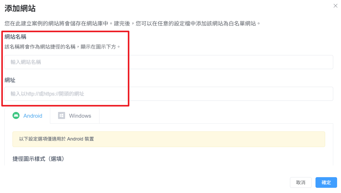 2. 請輸入您想新增到白名單的捷徑名稱和 URL。URL 必須以「http://」或「https://」開頭。