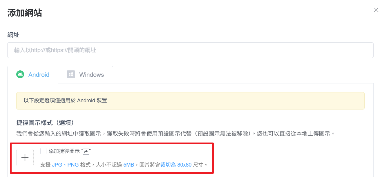 3. 我們的管理後台會從 URL 中自動偵測捷徑圖示,作為預設圖示。或者,您也可以點擊+按鈕上傳您自訂的圖示。您也可以在 Kiosk 模式中選擇新增捷徑圖示 (可選)。