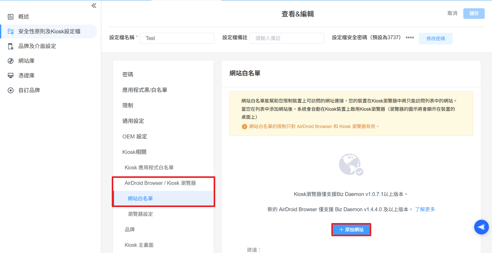 定檔 > AirDroid Browser / Kiosk Browser > 網站白名單 > +新增網站