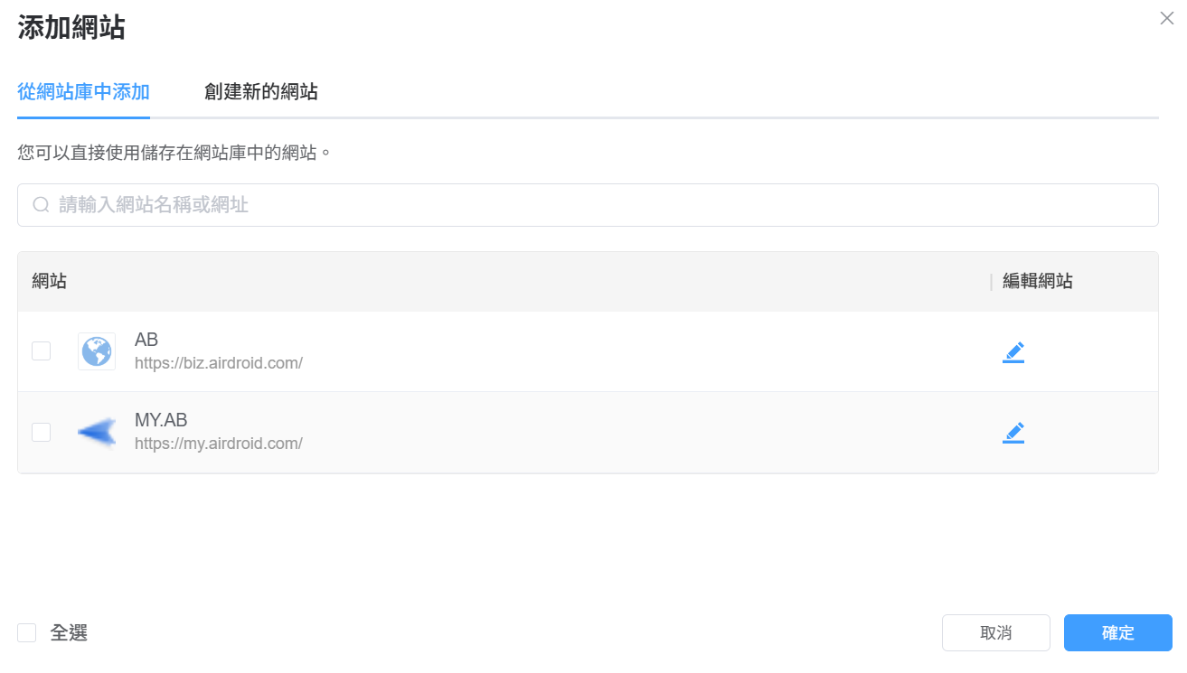 1. 前往管理後台 > 安全性原則及Kiosk > 網站庫 > +新增網站。 或者,開啟包含 Kiosk 模式的設定檔 > AirDroid Browser / Kiosk Browser > 網站白名單 > +新增網站 > 新增網站。