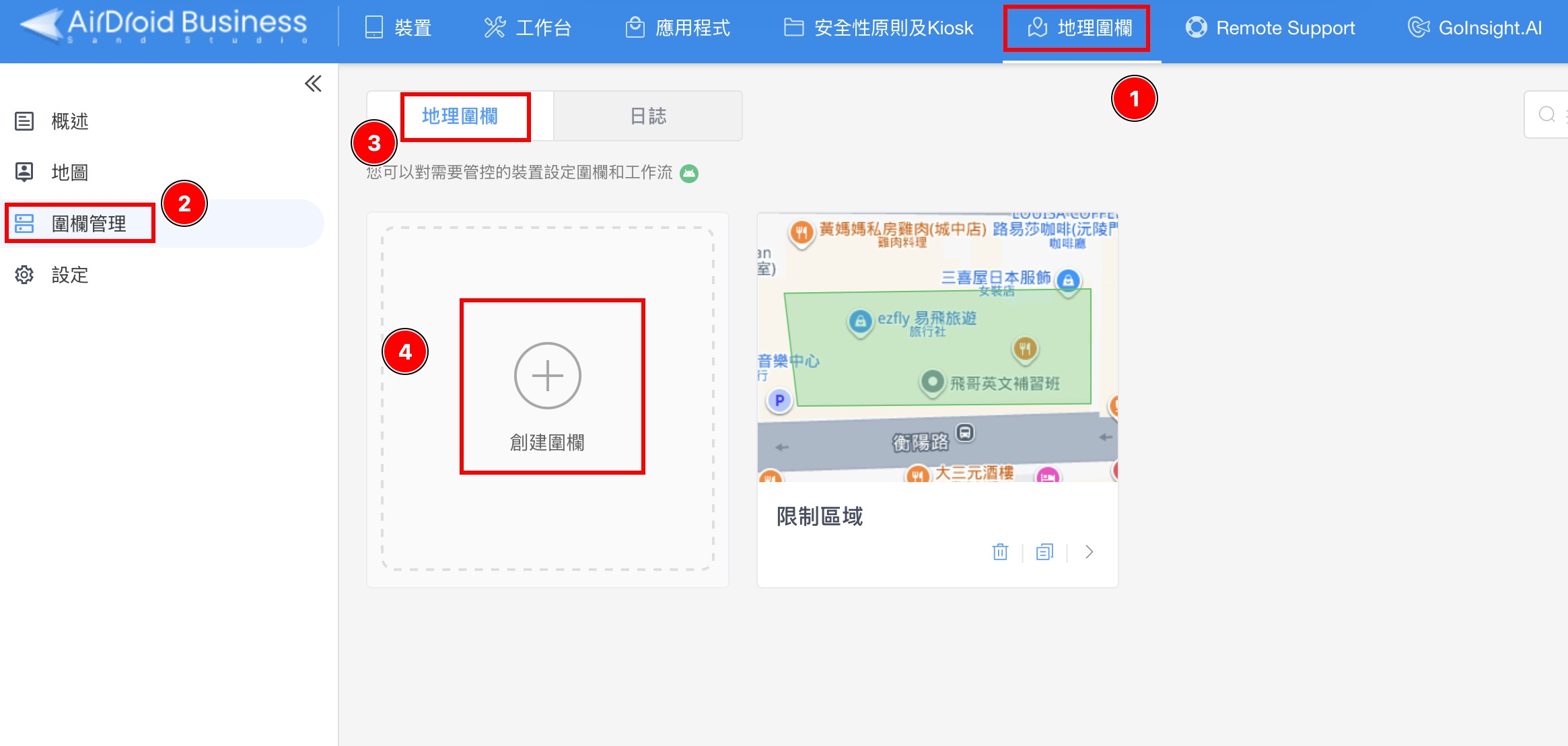 1. 從頁面頂部切換到地理圍欄選項卡>點擊地理圍欄管理>點擊+新增地理圍欄