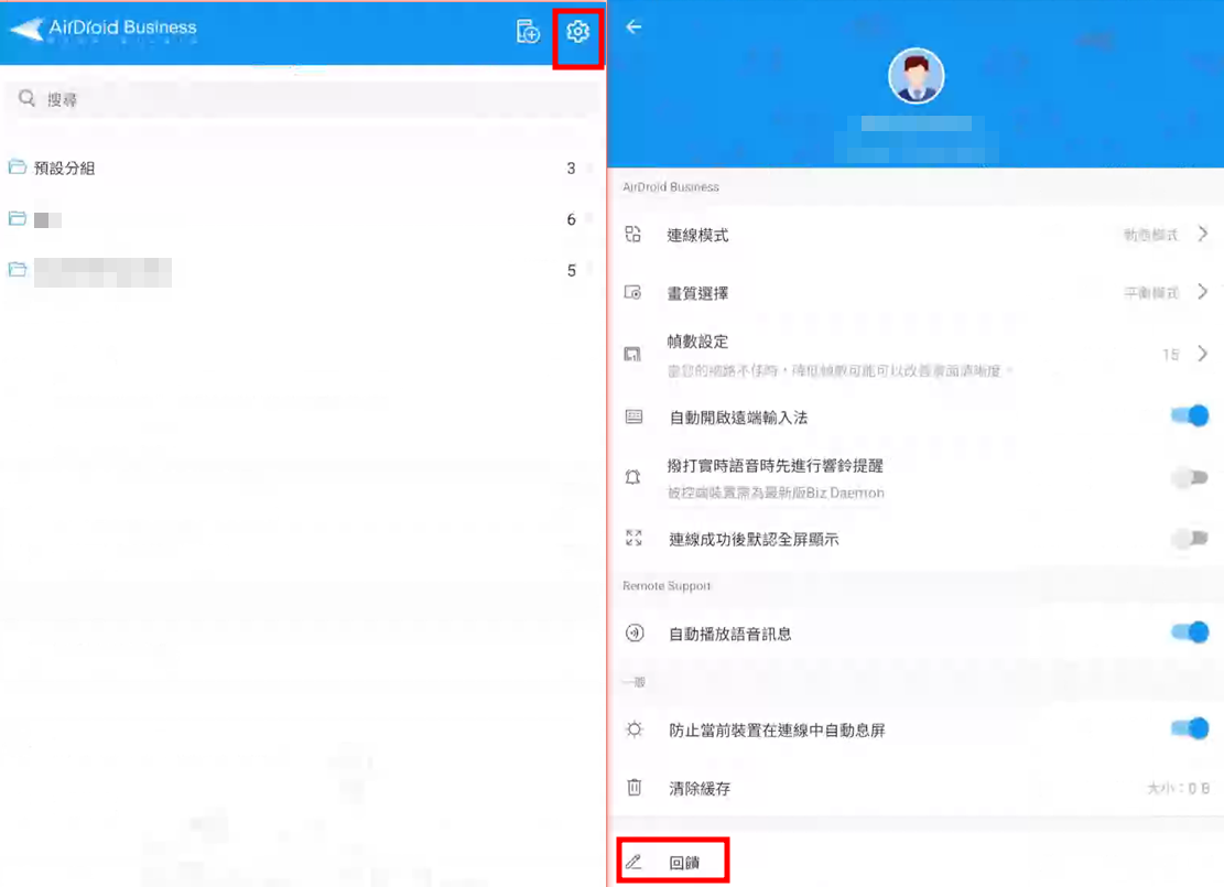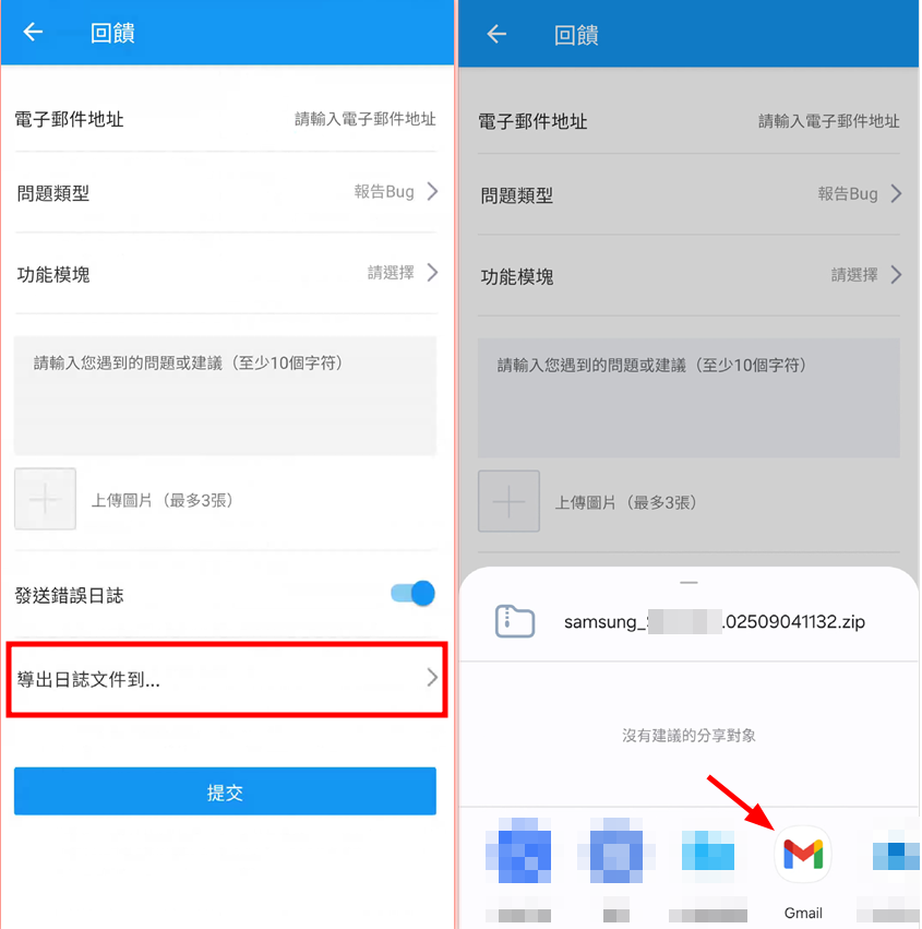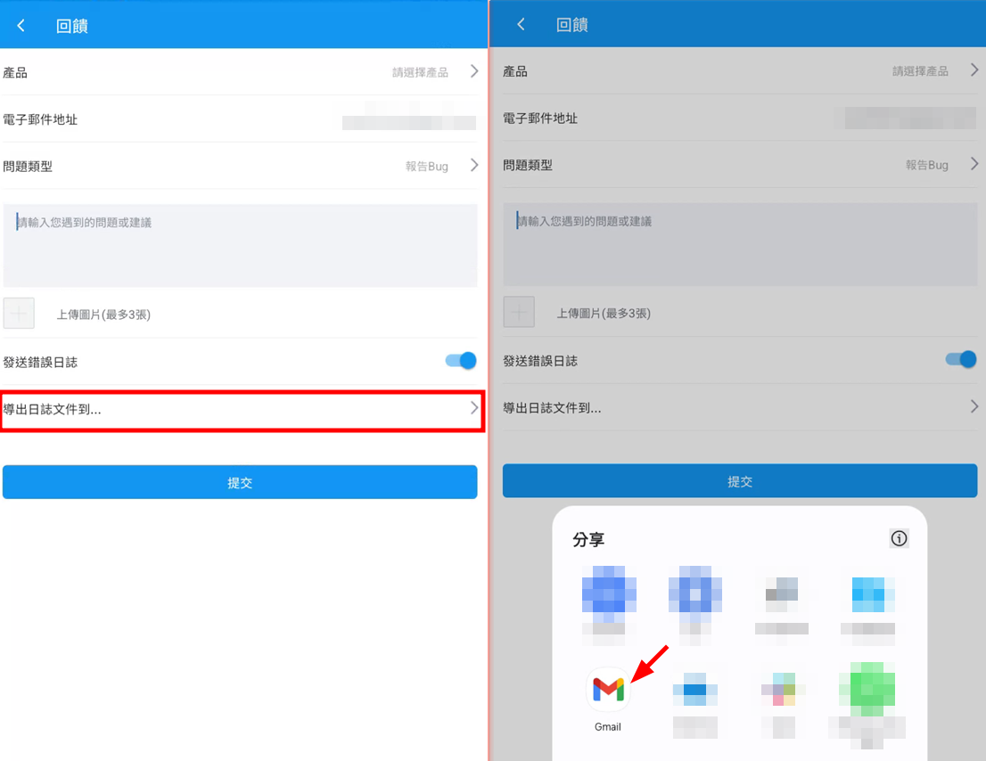 1. 開啟 AirDroid Business 應用程式 > 點選齒輪圖示 (或未登入時點選 ⋮ 圖示) > 回饋 > 點選 匯出日誌檔案至... > 選取任何Email應用程式 (例如:Gmail) 並將日誌附件透過Email發送給我們。