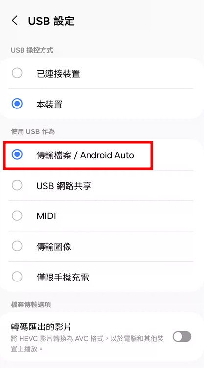 3. 或者,將裝置連接到您的電腦,並確保 USB 設定為傳輸檔案 / Android Auto / 檔案傳輸