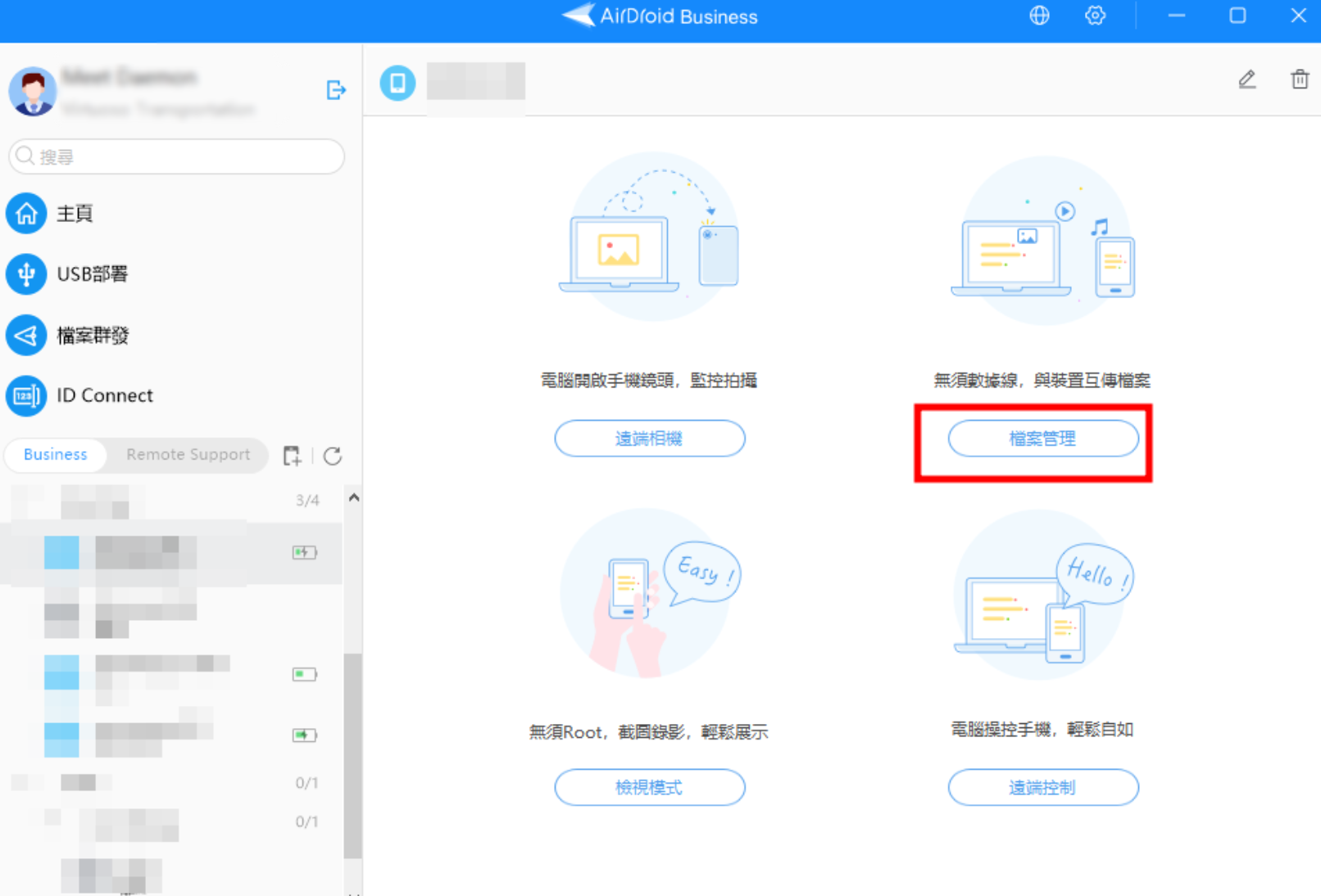 1. 前往 AirDroid Business 電腦端應用程式>找到受影響的裝置>點選檔案管理以開始檔案傳輸。
