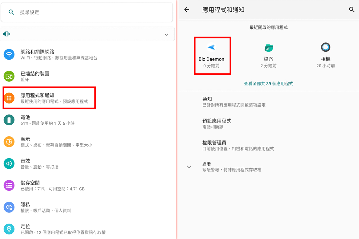 方法一: 前往 設定 > 應用程式與通知 > 點選最近開啟的應用程式中的 Biz Daemon(或在所有應用程式中點選 Biz Daemon) > 電池