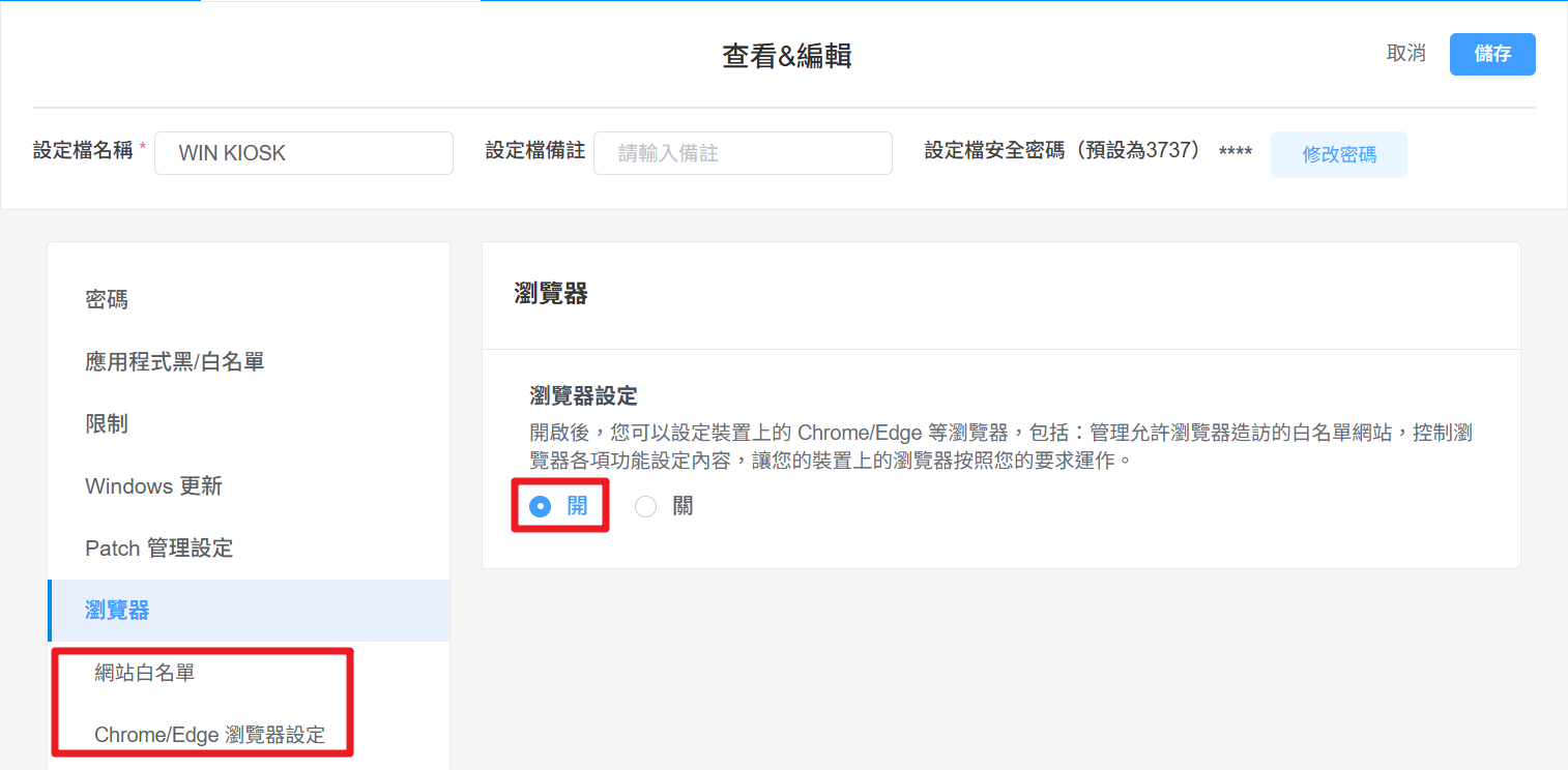 1. 前往管理後台 > 安全性原則及Kiosk > 開啟一個 Windows 設定檔 > 瀏覽器 > 選擇 開啟 瀏覽器配置 > 網站白名單 > +添加網站