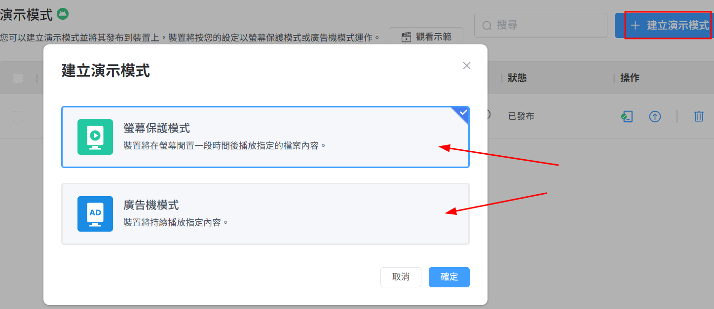 如果您先前已建立過演示模式,請點選+ 建立演示模式 > 選擇螢幕保護模式或廣告機模式。